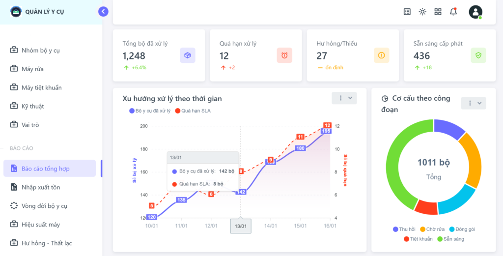 Hệ thống tự động hóa hoàn toàn các báo cáo phức tạp như: báo cáo nhập xuất tồn, vòng quay y cụ, tình hình gửi tiệt khuẩn bên ngoài và hiệu suất máy móc. Những con số này là cơ sở dữ liệu quan trọng để bệnh viện không ngừng cải tiến quy trình nghiệp vụ.