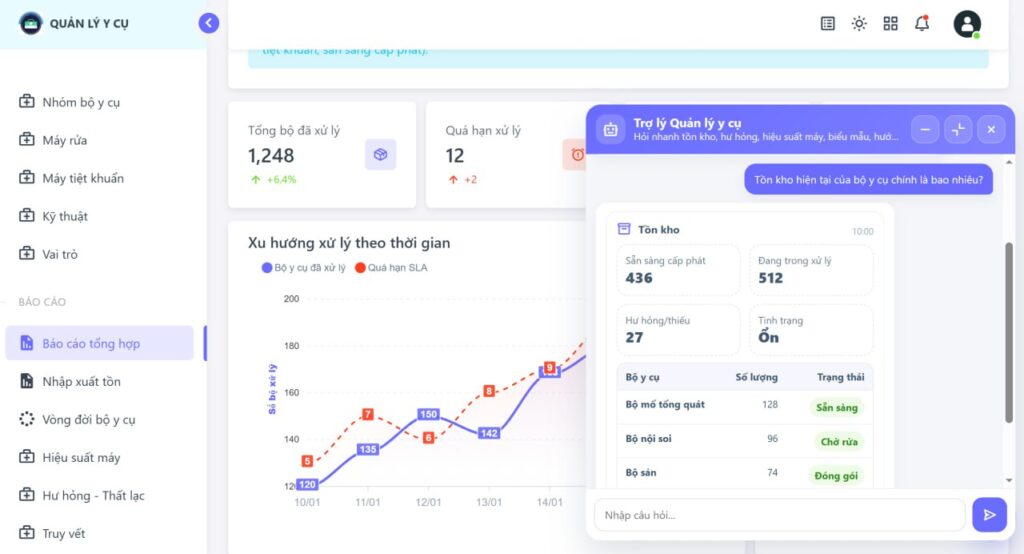 2. Ứng dụng Trí tuệ nhân tạo (AI): Tích hợp Chatbot AI hỗ trợ truy vấn nhanh các thông tin về hoạt động CSSD, so sánh số liệu giữa các thời kỳ và báo cáo tồn kho tức thì.