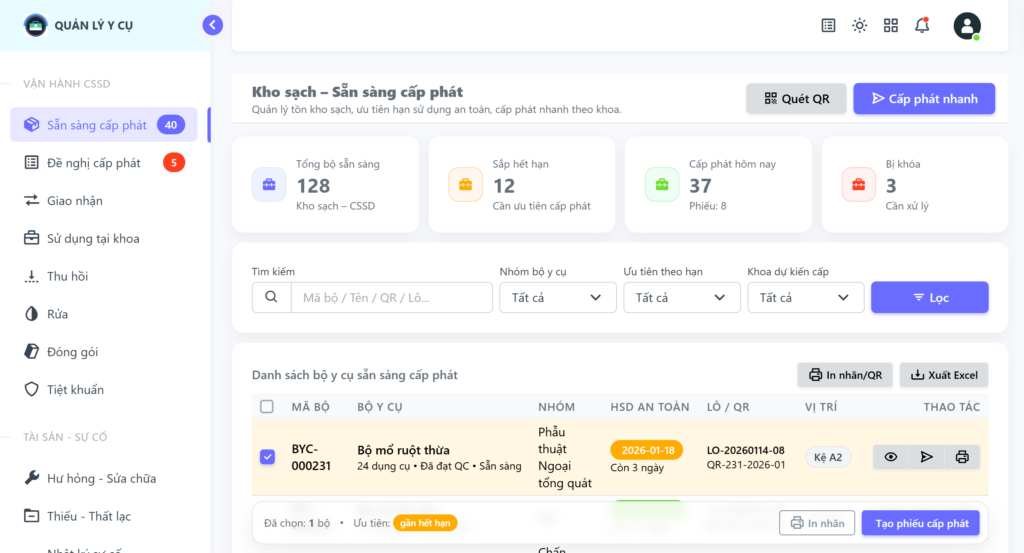 4. Di động hóa tác nghiệp: Việc hỗ trợ đầy đủ trên nền tảng Mobile App cho phép điều dưỡng và kỹ thuật viên thực hiện thao tác quét mã, giao nhận dụng cụ ngay tại giường bệnh hoặc cửa phòng mổ, tăng tính linh hoạt và giảm thời gian chờ đợi.